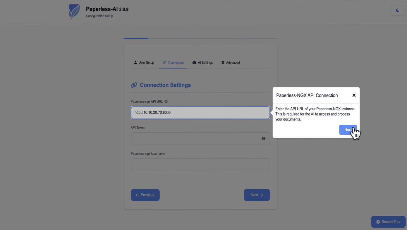 Go back to Paperless AI and paste the token in. Fill in your Paperless username as well.