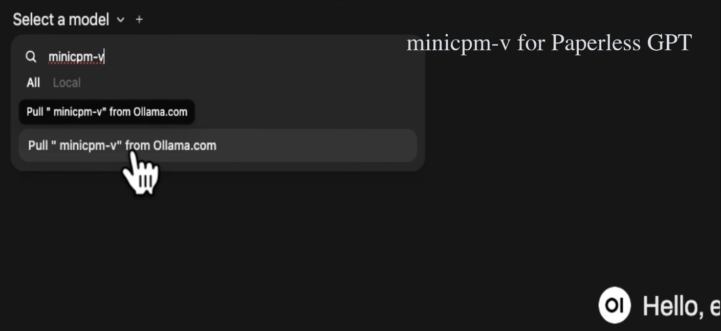 Second is the vision model. Type in minicpm-v and pull that from Ollama as well. This one's smaller, roughly 5 gigs. It's the model that'll look at scanned documents and photos and read the text out of them. I did try Qwen 2.5 VL 7B as well, which plenty of people recommend, but I ran into a bug on the newer versions of Ollama where it kept crashing on certain documents. MiniCPM-V has been rock solid for me. The Qwen vision model might be worth revisiting in the future, but at the time of writing this guide the current version of Ollama doesn't seem to get along with it.