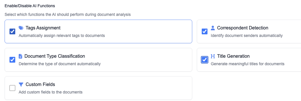 For process only specific pre-tagged documents, leave that set to no. Set add AI tag to documents to yes. That puts a marker on anything the AI has processed, so you can easily tell what's been done.