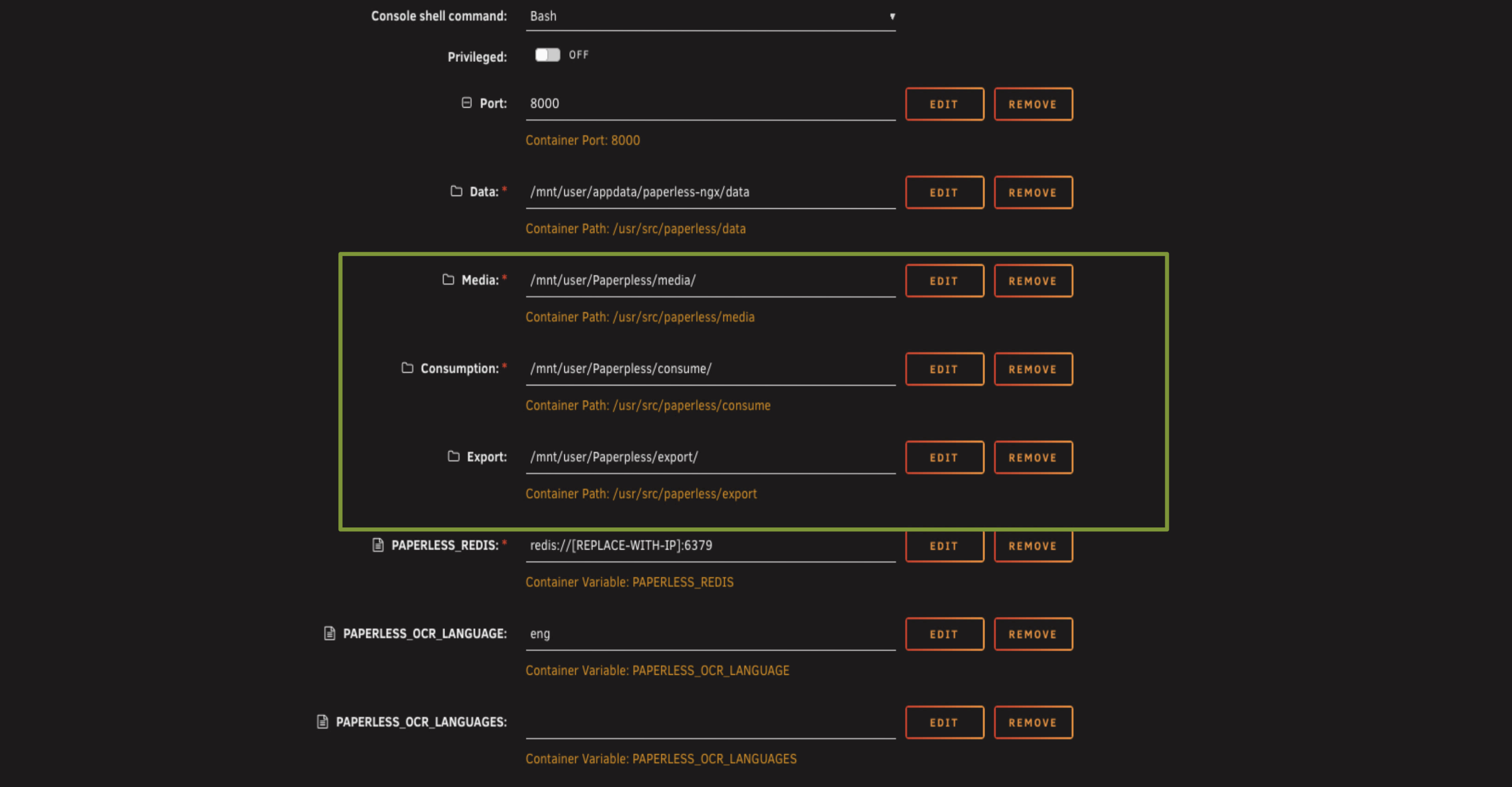 If you're planning to follow the rest of this guide, put these variables in now with your Unraid server's IP address. It'll save you coming back to edit the template later. If you're just setting up the basic Paperless system, you can skip these three entirely.