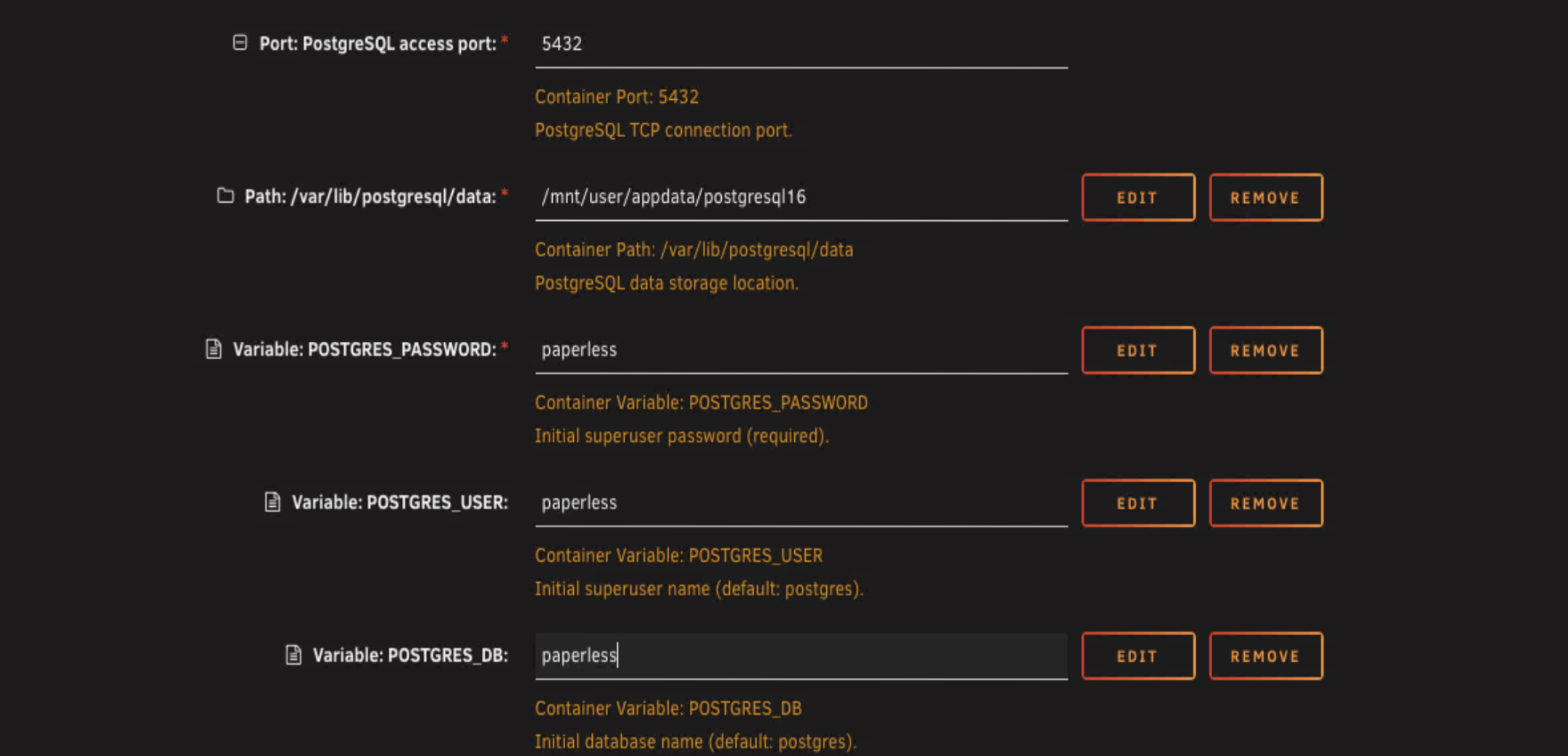 | Variable | PAPERLESS_DBPORT | 5432 | Postgres port (only change if you have another Postgres instance) |